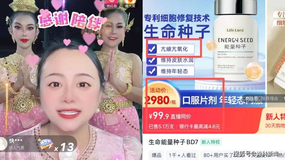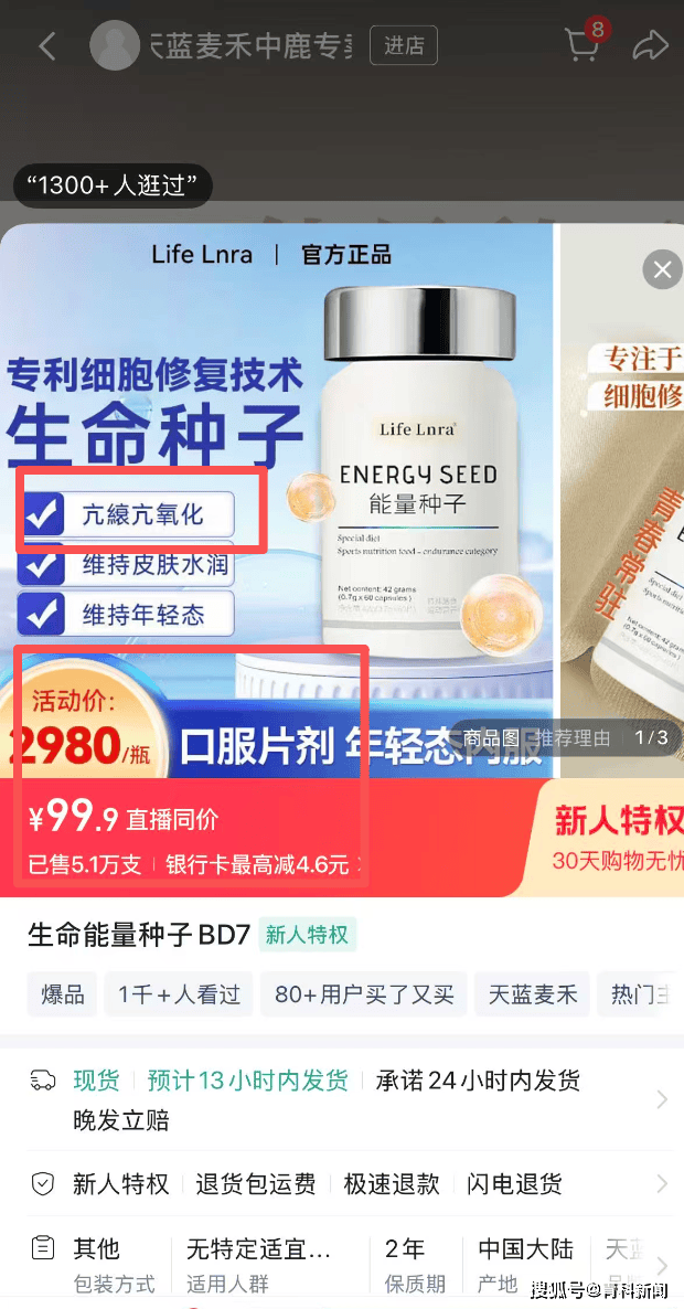 此外,“生命能量种子”的价格乱象尤为突出。根据“我是刘先生”账号商品图片显示,标价高达2980元/瓶的“生命能量种子”,直播加购后显示“直播同价99.9元”,价格差价超29倍,疑似通过虚构高价误导消费者感知价值。该商品宣传标注“专利细胞修复技术”“抗衰抗氧化”,但商品详情页未提供任何专利证明、检测报告或功效说明。