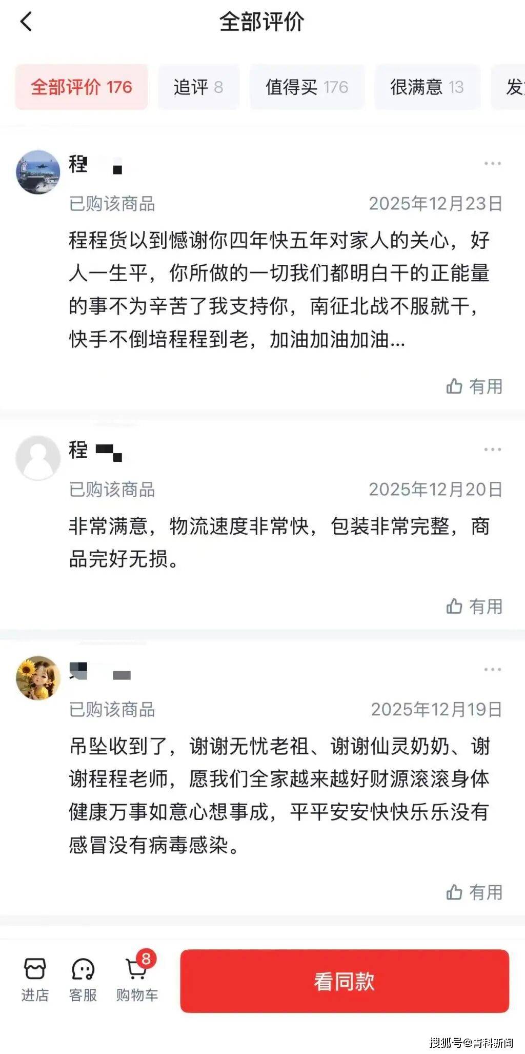 在“程程正能量”的商品页面,“佛牌吊坠”显示100%的好评,评论区已购该商品的用户评价也大多数好评,充斥着类似“谢谢无忧老祖、谢谢仙灵奶奶、谢谢程程,愿身体健康,没有感冒,没有病毒感染”“我一直支持你,快手不倒,陪程程到老”的评语。