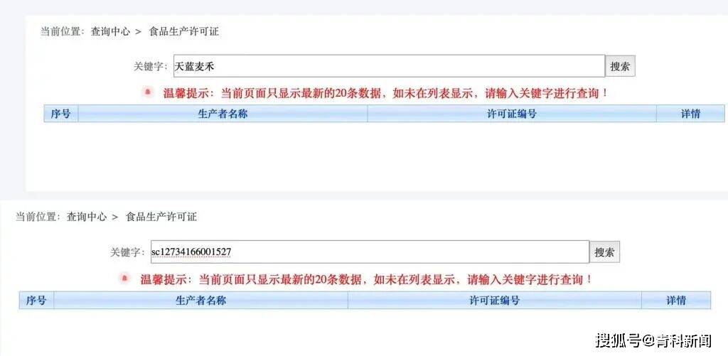 上述产品中,“光波芯片能量服”产品图片显示,外包装以深蓝色为主色调,漩涡状的科技光纹搭配宇航员图案,袋身印刻的字体扭曲,下方的辅助文字与标识却显示为乱码。然而,能量服商品里却标注了食品生产许可证编号(sc527),值得注意的是,该商品链接中,系统提示“以上信息由商家自主填写”。澎湃新闻在食品生产许可获证企业信息平台输入商家名称和编号,均查询不到该产品的相关信息。