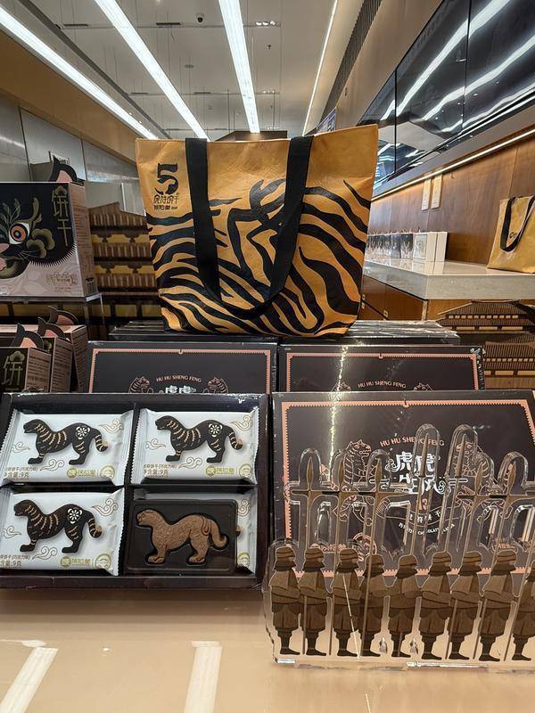 在咖啡店旁边还有一家文创点心品牌——陕拾叁国宝味道主题店。作为西安本土原创品牌,陕拾叁与陕西历史博物馆合作的这家国宝味道主题店,通过售卖“虎符饼干”“神兽瓦片”“浪浪西安饼干”等富有本土特色的文创食品,成为外地游客“带得走的长安记忆”。
