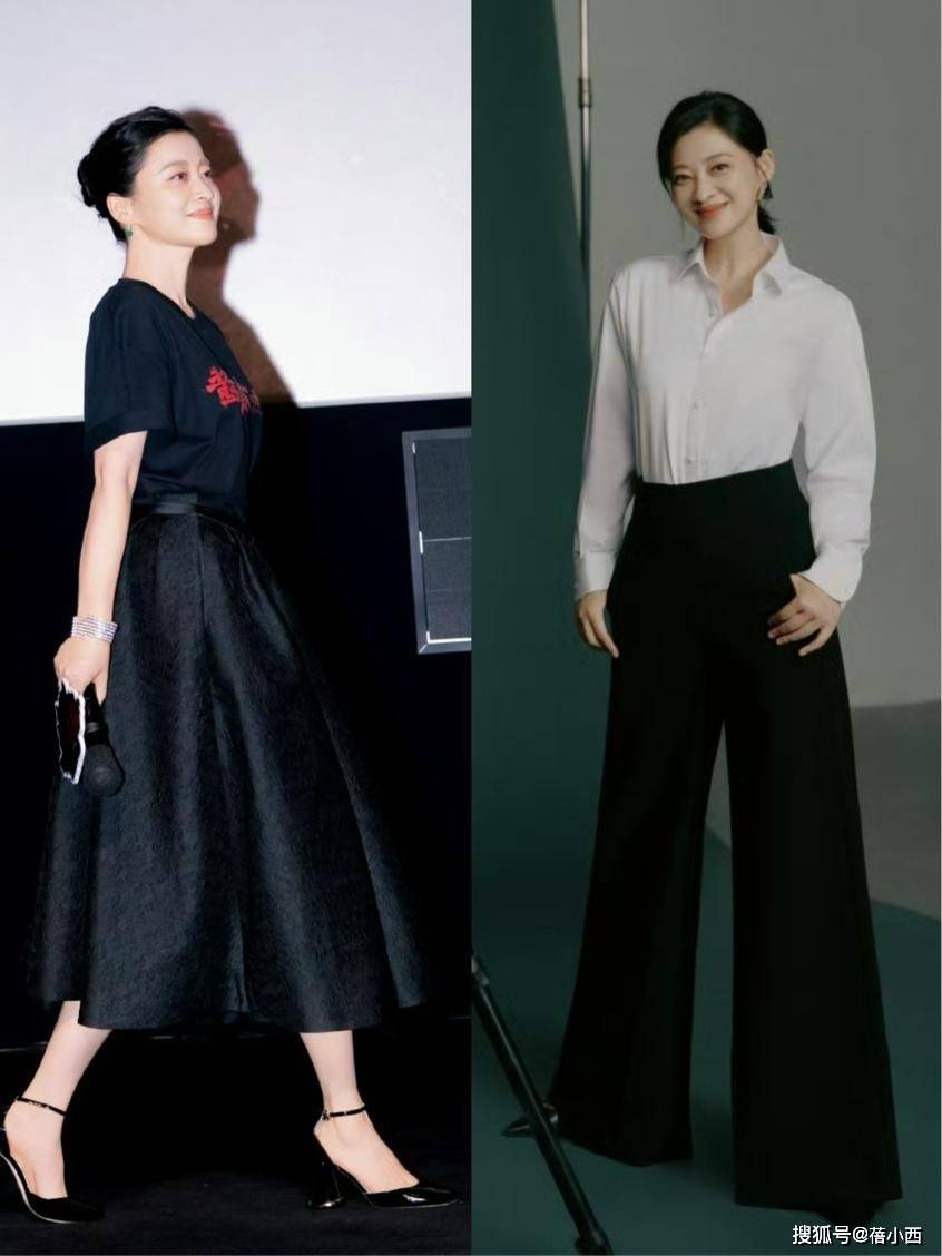 此外,她还特别偏爱中长款裙装的搭配,比如 A 字裙、直筒裙,既能遮盖腿部线条,又能凸显女性的柔美,像这种衬衫搭配半身裙的造型,自带女人味,再配上一双浅口高跟鞋,优雅又知性,不经意间就优化了比例,显得身材特别好。